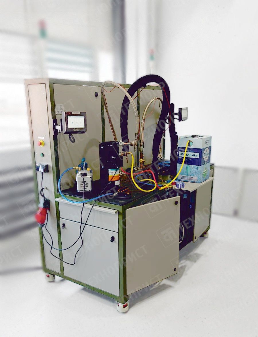 Стенд предназначен для приемо-сдаточных испытаний холодильных компрессоров разных типов, обеспечивая проверку их работоспособности и измерение холодопроизводительности. В процессе тестирования регистрируются параметры давления, температуры, расхода газа, а также электрические характеристики (ток, напряжение, мощность) по фазам. Все данные отображаются на встроенном сенсорном экране.